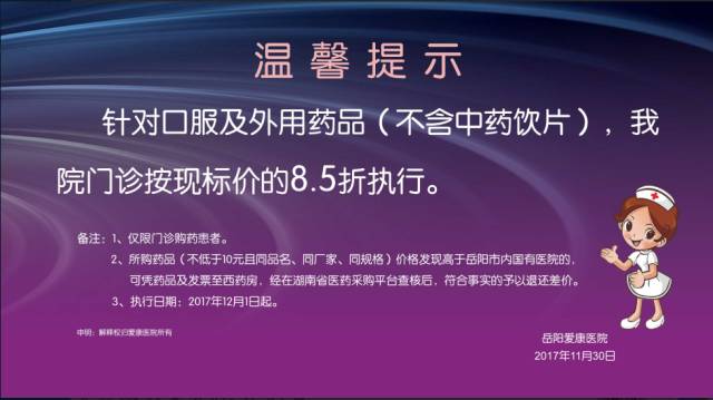 為破除“以藥養(yǎng)醫(yī)”,減輕民眾看病負擔,根據(jù)湖南省醫(yī)藥采購平臺的標準,岳陽愛康醫(yī)院將于2017年12月1日起對門診病患購藥價格進行如下調整: