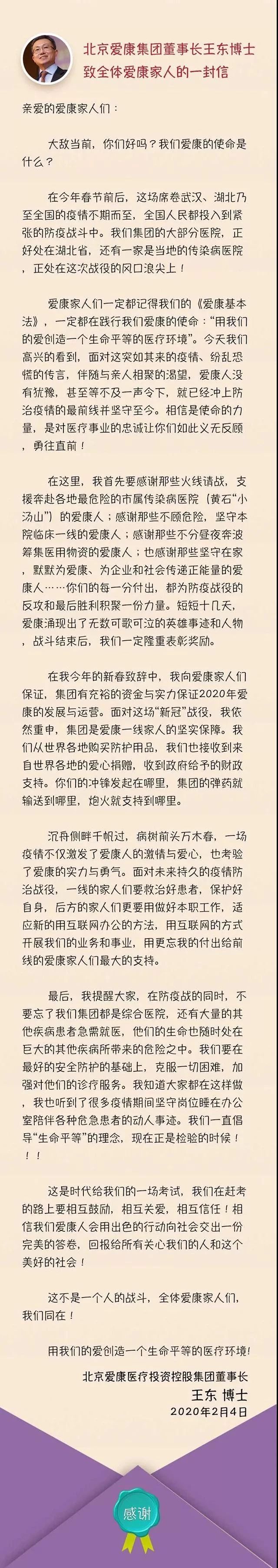 抗擊疫情 眾志成城 | 北京愛康集團董事長王東博士致全體愛康家人的一封信