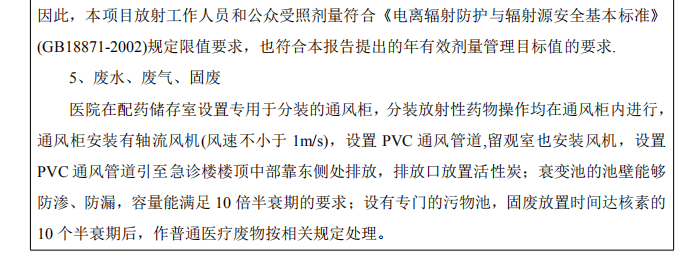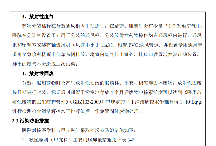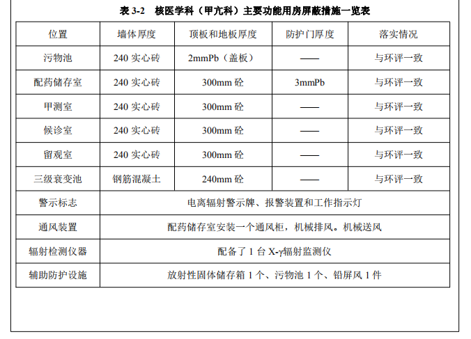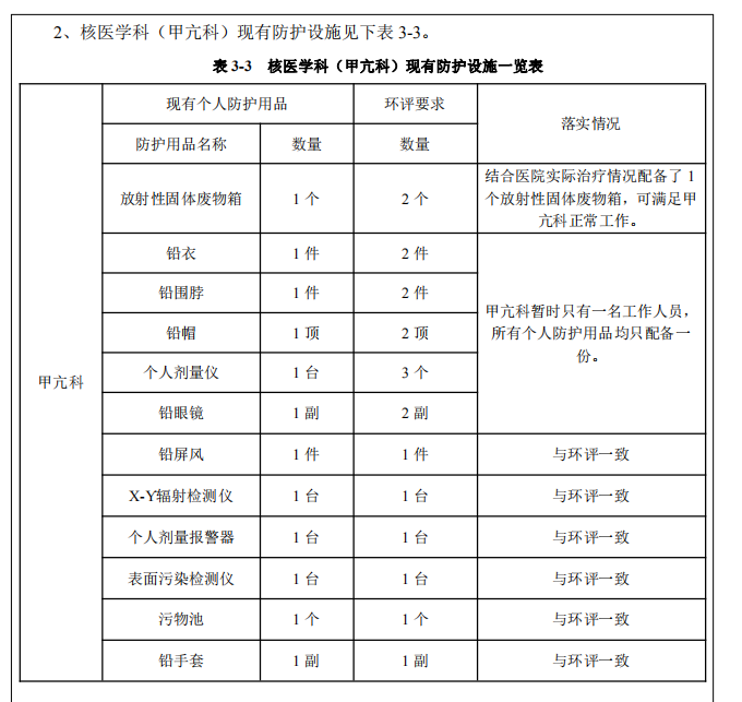 甲亢科?房位于急診樓相連建筑?北??層,本項(xiàng)??作場所按照環(huán)評要求進(jìn)?改建。觀察窗為 3mm 鉛當(dāng)量,防護(hù)?為 3mm 鉛當(dāng)量;建有通?裝置和廢?三級衰變池并設(shè)置電離輻射警示標(biāo)識。輻射?作?員配備了個?劑量計(jì)、鉛?、鉛帽和鉛眼鏡等防護(hù)?品。
