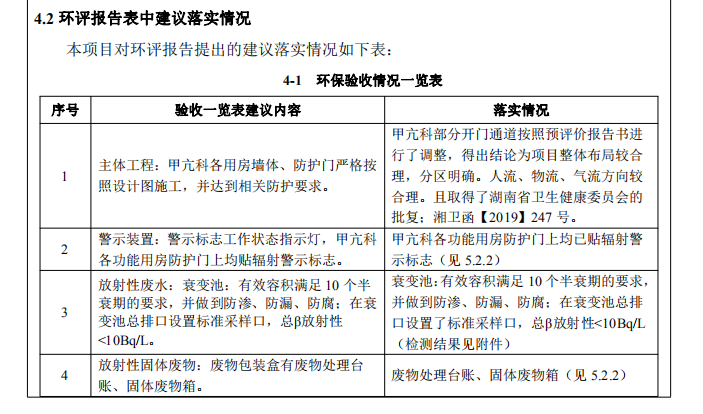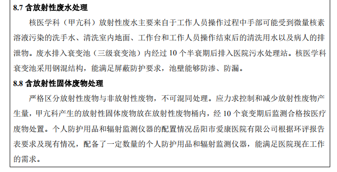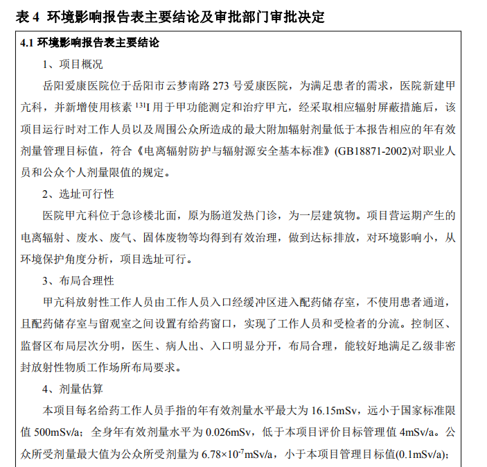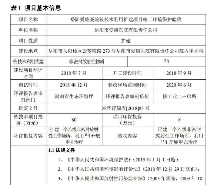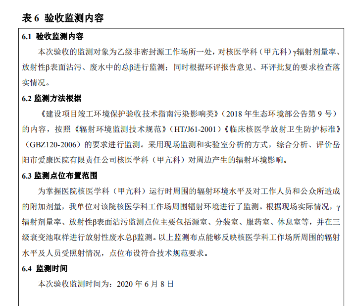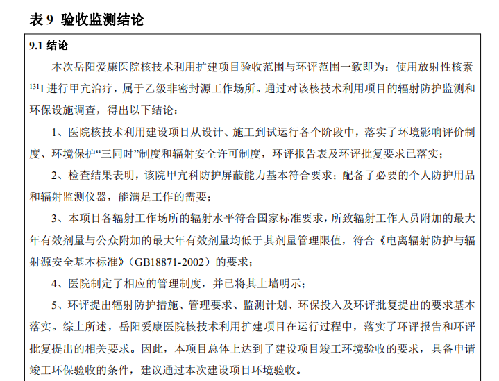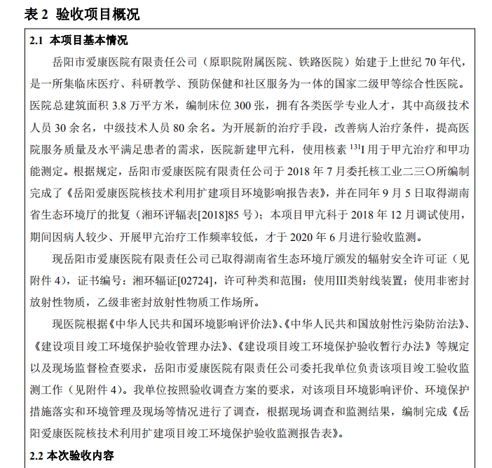2020 年 11 ? 11 ?,岳陽市愛康醫(yī)院有限責(zé)任公司根據(jù)《建設(shè)項(xiàng)?竣?環(huán)境保護(hù)驗(yàn)收暫?辦法》、環(huán)境影響評價(jià)報(bào)告表及批復(fù)?件等要求,組織有關(guān)專家和單位召開驗(yàn)收會議(驗(yàn)收組名單?簽到表),對核技術(shù)利?擴(kuò)建項(xiàng)?(已建?個?級?密封放射性?作場所,利? 131I 開展甲亢治療)進(jìn)?竣?環(huán)境保護(hù)驗(yàn)收,驗(yàn)收組部分成員進(jìn)?了現(xiàn)場踏勘、查閱了資料,形成如下意見: