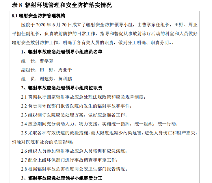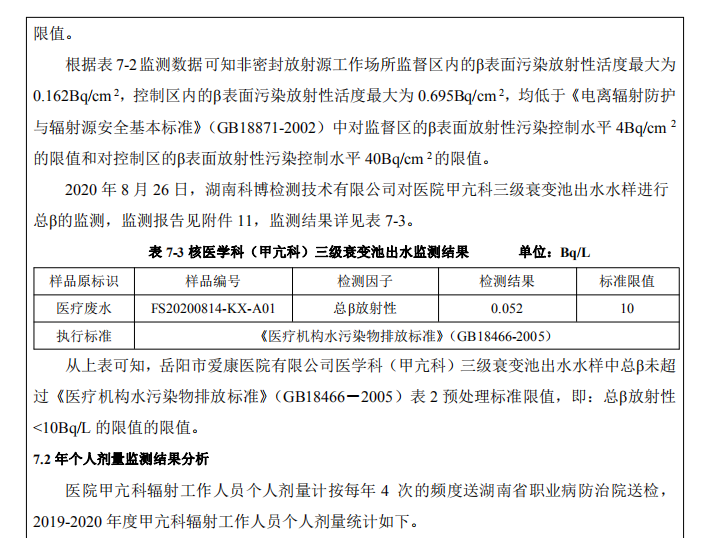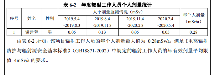 根據(jù)湖南省職業(yè)病防治院出具的 2019 年-2020 年年度的岳陽市愛康醫(yī)院有限責(zé)任公司個?劑量監(jiān)測報(bào)告顯示:輻射?作?員的個?劑量均滿?環(huán)評報(bào)告中的有關(guān)要求。