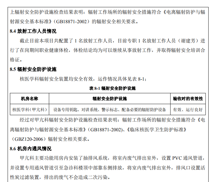 根據(jù)湖南凱星環(huán)??萍加邢薰緦υ狸枑劭滇t(yī)院核技術(shù)利?擴(kuò)建項(xiàng)?現(xiàn)場驗(yàn)收監(jiān)測報(bào)告數(shù)據(jù)顯示:各監(jiān)測點(diǎn)位γ輻射劑量率、放射性β表?沾污、廢?總β,均滿?環(huán)評報(bào)告表中的有關(guān)要求。